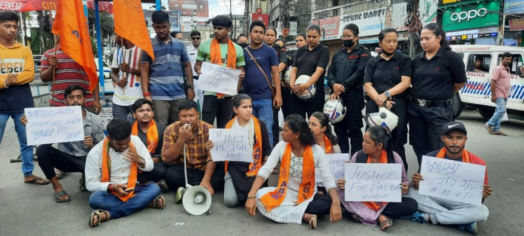 শিলিগুড়ি, ২৩ জুলাইঃ মালদায় দুই মহিলাকে বিবস্ত্র করে মারধরের ঘটনার প্রতিবাদে শিলিগুড়িতে সরব হল অখিল ভারতীয় বিদ্যার্থী পরিষদ(এবিভিপি)।রবিবার শিলিগুড়ির হাসমি চকে পথ অবরোধ করে বিক্ষোভ দেখায় এবিভিপির কর্মী সমর্থকরা।