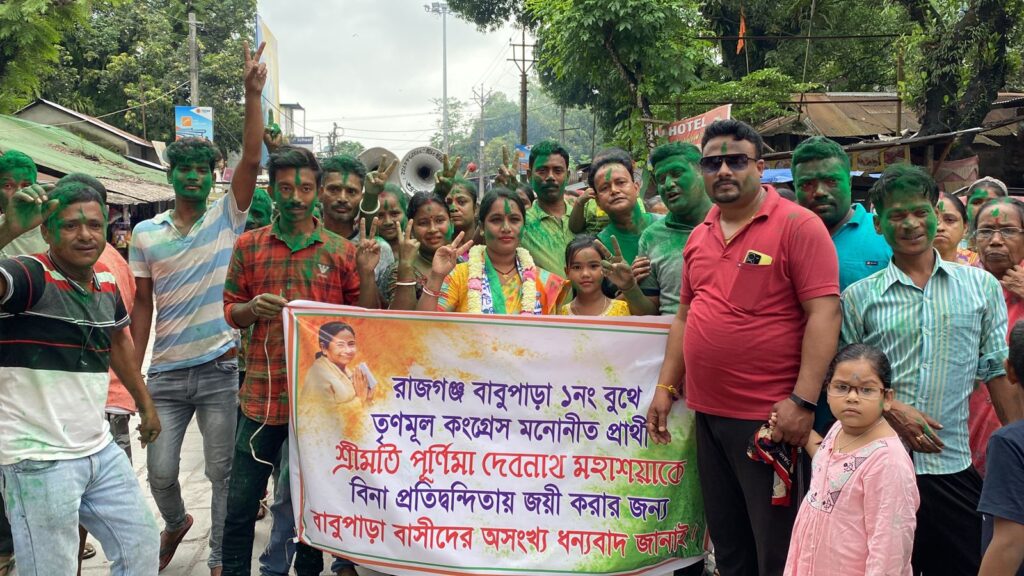মঙ্গলবার রাজগঞ্জ বাজারে ১ নং বুথের তৃণমূল কর্মী সমর্থকেরা এই নিয়ে বিজয় মিছিল বের করেন।ব্যান্ড পার্টি বাজিয়ে, আবির খেলে বিজয় উল্লাসে মাতেন কর্মী সমর্থকেরা।