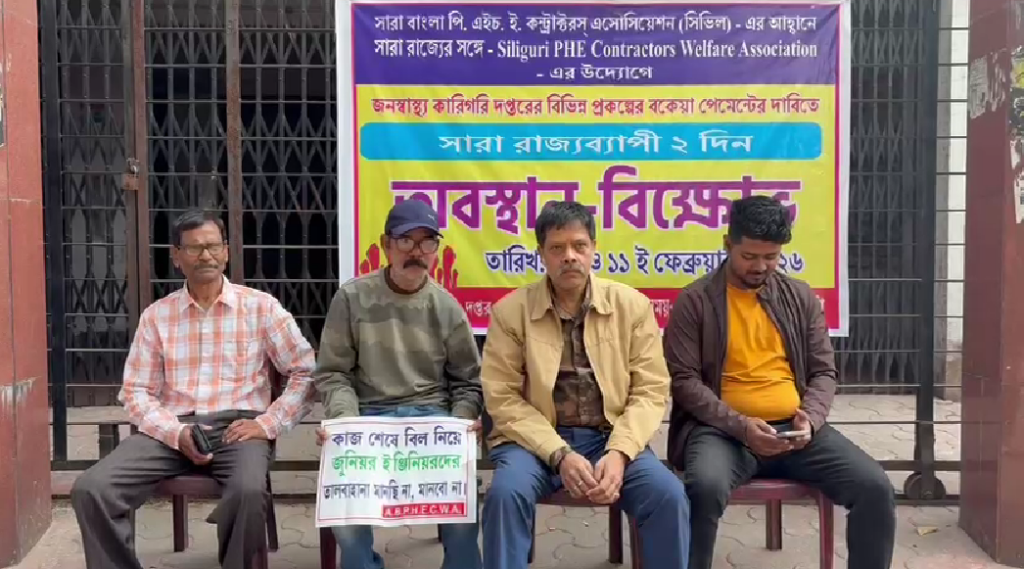 শিলিগুড়ি, ১১ ফেব্রুয়ারিঃ সারা বাংলা পিএইচই কন্ট্রাক্টরস অ্যাসোসিয়েশন (সিভিল)-এর আহ্বানে এবং শিলিগুড়ি পিএইচই কন্ট্রাক্টরস ওয়েলফেয়ার অ্যাসোসিয়েশনের উদ্যোগে জনস্বাস্থ্য কারিগরি দপ্তরের বিভিন্ন প্রকল্পের বকেয়া টাকার দাবিতে শিলিগুড়িতে দুদিনব্যাপী অবস্থান-বিক্ষোভ কর্মসূচি গ্রহণ করা হয়েছে।