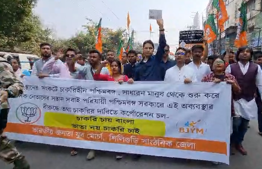 শিলিগুড়ি, ১৬ ফেব্রুয়ারিঃ বেকার ভাতার বিরোধিতা এবং চাকরির দাবীতে শিলিগুড়িতে মিছিল ও পুরনিগম অভিযান করলো ভারতীয় জনতা যুব মোর্চা।এদিনের কর্মসূচিতে উপস্থিত ছিলেন সাংসদ রাজু বিস্ত, বিধায়ক শঙ্কর ঘোষ সহ অন্যান্য নেতৃত্বরা।
