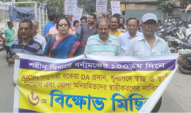 শিলিগুড়ি, ৬ মেঃ ডিএ এর দাবীতে আন্দোলনের ১০০তম দিনে শিলিগুড়িতে মিছিল করলো সংগ্রামী যৌথ মঞ্চ।