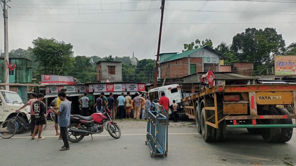 রাজগঞ্জ, ৫ আগস্টঃ জলপাইগুড়ি সংলগ্ন দশদরগা এলাকায় পথ দুর্ঘটনা।এক লেন থেকে অন্য লেন পার করে বাজারের দিকে ঢুকে পড়ল ১৪ চাকার ট্রেলার। অল্পের জন্য প্রাণে বাঁচলেন দোকানে থাকা মানুষেরা।