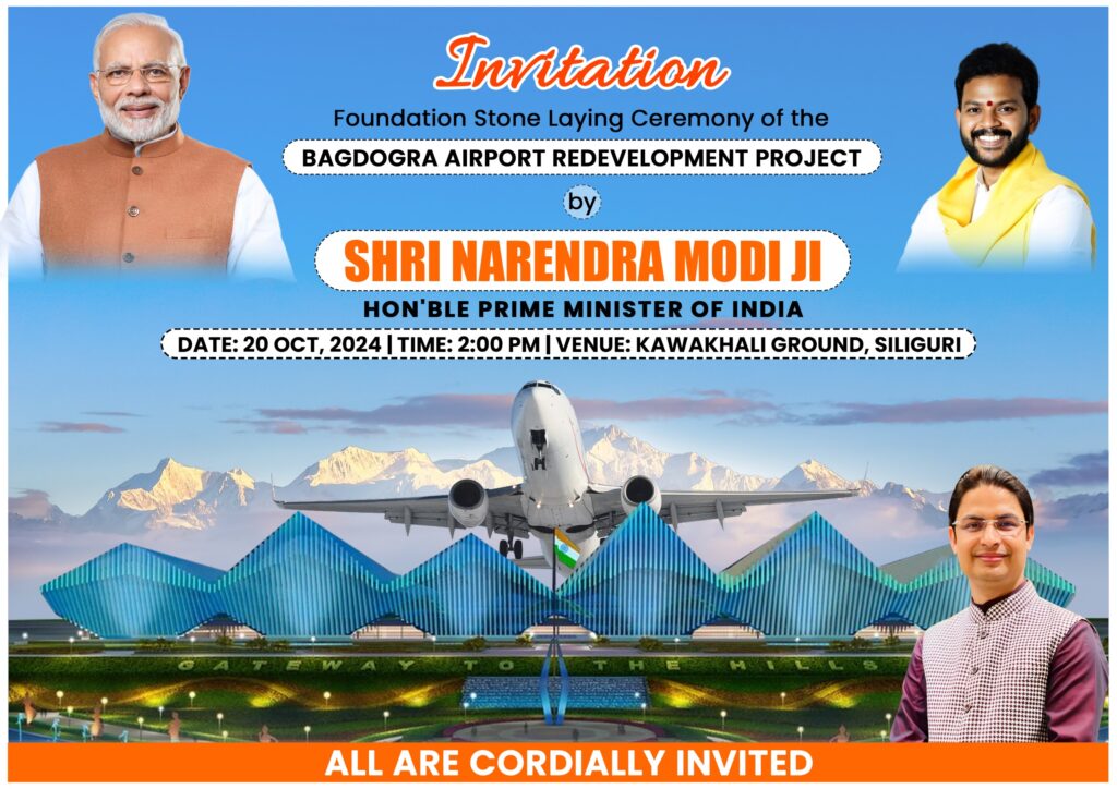 শিলিগুড়ি, ১৮ অক্টোম্বরঃ আগামী ২০ অক্টোবর বাগডোগরা বিমানবন্দরের নতুন টার্মিনাল প্রজেক্টের শিলান্যাস করবেন প্রধানমন্ত্রী নরেন্দ্র মোদী।প্রেস বিজ্ঞপ্তি জারি করে জানালেন দার্জিলিং এর সাংসদ রাজু বিস্ত।