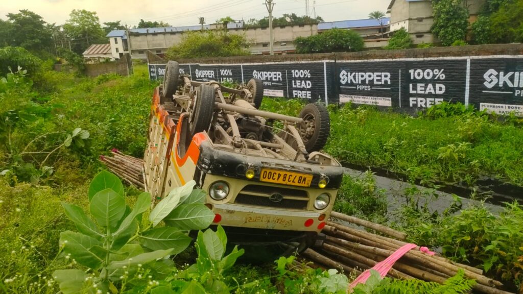 জানা গিয়েছে, প্যান্ডেলের সামগ্রী বোঝাই একটি গাড়ি জলপাইগুড়ির দিকে যাচ্ছিল। জিয়াগঞ্জ এলাকায় এলে গাড়ির সামনের চাকা ফেটে নিয়ন্ত্রণ হারিয়ে রাস্তার পাশে নয়ানজুলিতে উল্টে যায় গাড়িটি।ঘটনায় একজন আহত হন।