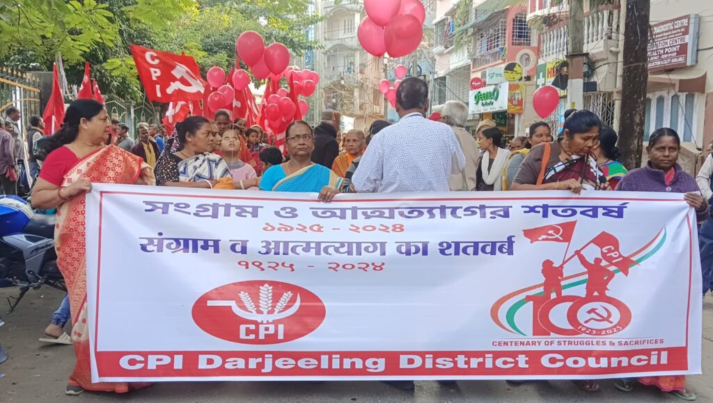বৃহস্পতিবার হাতে বেলুন ও দলীয় পতাকা নিয়ে শহরের বিভিন্ন এলাকা পরিক্রমা করল ভারতীয় কমিউনিস্ট পার্টি দার্জিলিং জেলা পরিষদ।এই শতবর্ষকে ঘিরে সারা বছর বিভিন্ন কর্মসূচি গ্রহণ করা হয়েছে। তারই অঙ্গ হিসেবে এই মিছিল বলে জানিয়েছেন দলীয় কর্মীরা। মিছিলে কয়েকশো মানুষ পা মেলান।