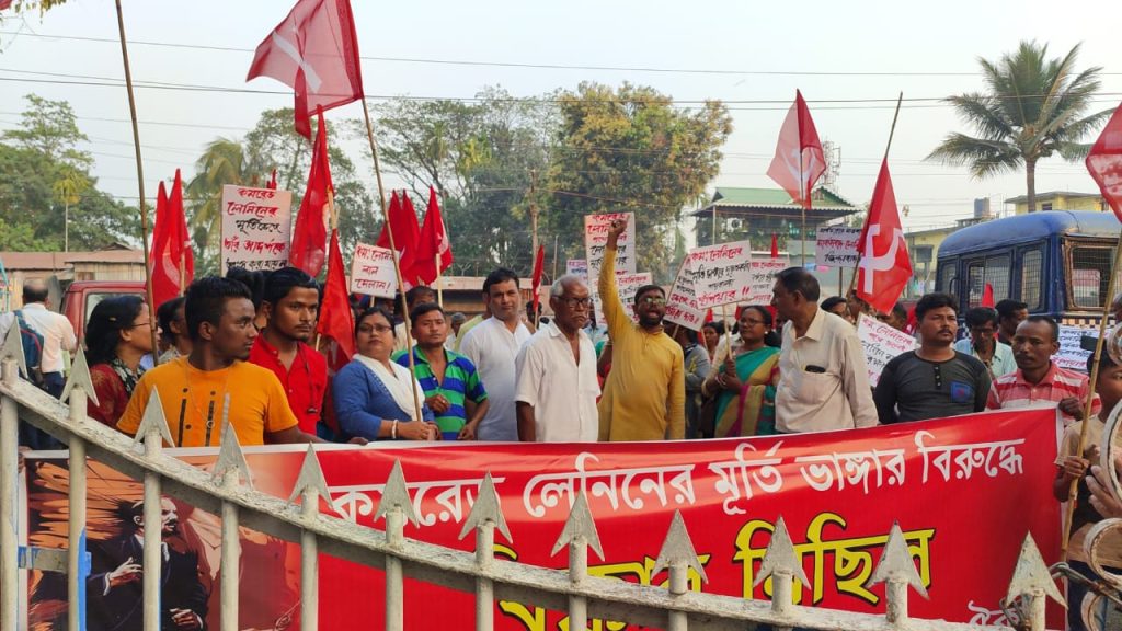 নকশালবাড়ি, ১২ মার্চঃ নকশালবাড়িতে লেনিনের মূর্তি ভেঙে দেওয়ার ঘটনায় দোষীদের গ্রেফতারের দাবিতে ও পুলিশি নিষ্ক্রিয়তার অভিযোগ তুলে নকশালবাড়িতে বিক্ষোভ ও মিছিল করল ফ্যাসিবাদ বিরোধী গনতান্ত্রিক ঐক্য সংগঠন।