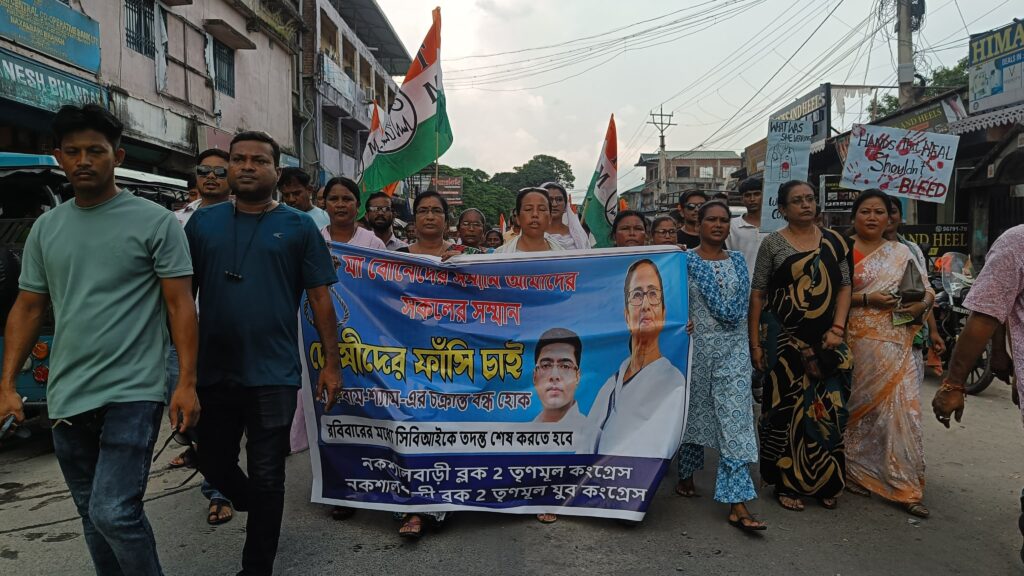নকশালবাড়ি, ১৭ আগস্টঃ আরজি কর হাসপাতালে মহিলা চিকিৎসককে ধর্ষণ ও খুনের ঘটনায় দোষীদের গ্রেফতার ও ফাঁসির দাবিতে প্রতিবাদ মিছিল নকশালবাড়ি ব্লক ২ তৃণমূল কংগ্রেসের।