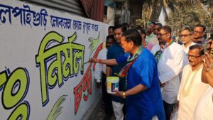 প্রচারের পাশাপাশি রাজগঞ্জ ব্লক যুব তৃণমূল কংগ্রেসের পক্ষ থেকে আমবাড়িতে দেওয়াল লিখন করেন প্রার্থী নির্মল চন্দ্র রায় ও বিধায়ক খগেশ্বর রায়।