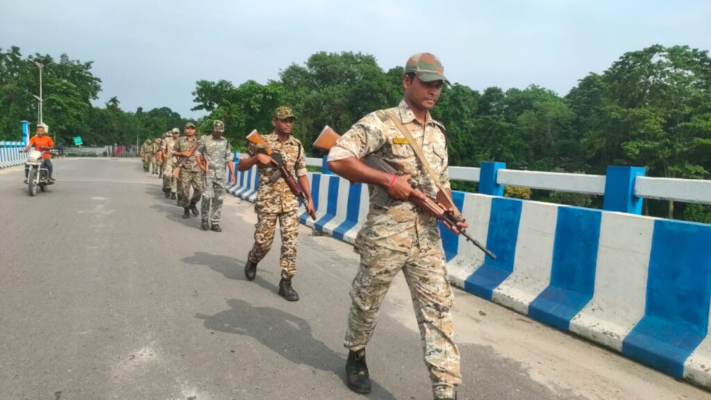 রাজগঞ্জ, ২৩ জুনঃ আগামী ৮ই জুলাই ত্রিস্তরীয় পঞ্চায়েত নির্বাচন।নির্বাচন শান্তিপূর্ণ করার লক্ষ্যে রুট মার্চ পুলিশের।