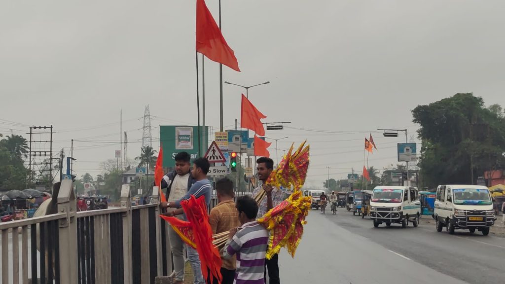 সোমবার সকাল থেকেই ফুলবাড়ির বিভিন্ন যায়গায় গেরুয়া পতাকা ও ফ্লেক্স লাগাতে দেখা রামনবমী মহোৎসব সমিতির সদস্যদের।
