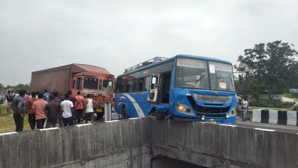 স্থানীয় সূত্র জানা গিয়েছে, জলপাইগুড়ি দিক থেকে একটি যাত্রীবাহী বাস শিলিগুড়ির দিকে আসছিল।সেইসময় তালমা সংলগ্ন এলাকায় একটি মালবোঝাই কনটেনারের সঙ্গে সংঘর্ষ ঘটে। ফলে নিয়ন্ত্রণ হারিয়ে যাত্রীবাহী বাসটি রাস্তার পাশে থাকা কালভার্টের রেলিং এর ওপরে উঠে যায়।