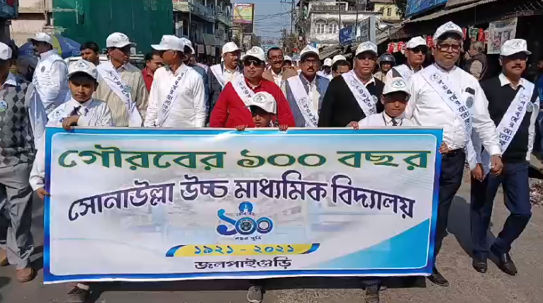 জলপাইগুড়ি, ৭ জানুয়ারিঃ জলপাইগুড়ির সোনাউল্লা উচ্চমাধ্যমিক বিদ্যালয়ের শতবর্ষ পূর্তি উপলক্ষে বর্ণাঢ্য শোভাযাত্রার আয়োজন করা হল। মঙ্গলবার স্কুল প্রাঙ্গন থেকে শুরু হয়ে গোটা জলপাইগুড়ি শহর পরিক্রমা করে এই শোভাযাত্রা।