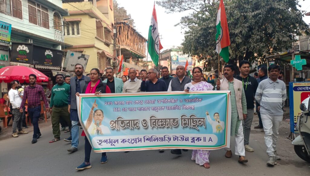 শিলিগুড়ি, ২৫ জানুয়ারিঃ অপরিকল্পিত ও অমানবিক SIR-এর কারণে ১২৬ জনের প্রাণ গিয়েছে’এই অভিযোগ তুলে SIR-এর নামে সাধারণ মানুষকে হয়রানির বিরুদ্ধে শিলিগুড়িতে প্রতিবাদ ও বিক্ষোভ মিছিল করলো তৃণমূল কংগ্রেস।রবিবার তৃণমূল কংগ্রেস শিলিগুড়ি টাউন ব্লক ২ এর উদ্যোগে এই কর্মসূচির আয়োজন করা হয়।