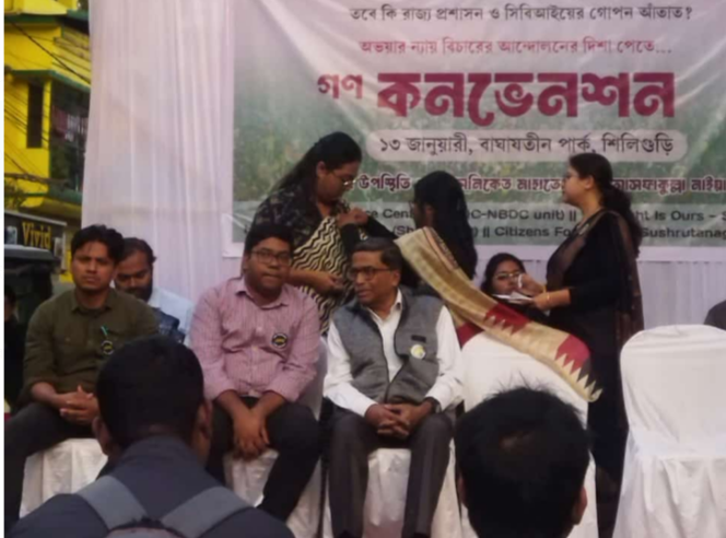 শিলিগুড়ি, ১৩ জানুয়ারিঃ আরজি কর কান্ডের পাঁচ মাস পরও অধরা বিচার।তথ্যপ্রমাণ লোপাট, সিবিআইয়ের সঙ্গে আঁতাতের অভিযোগ তুলে এবং ন্যায় বিচারের দাবীকে সামনে রেখে সোমবার শিলিগুড়িতে গণ কনভেনশনের আয়োজন করলো মেডিক্যাল সার্ভিস সেন্টার, দ্যা নাইট ইজ আওয়ার্স সহ বেশ কয়েকটি সংগঠন।