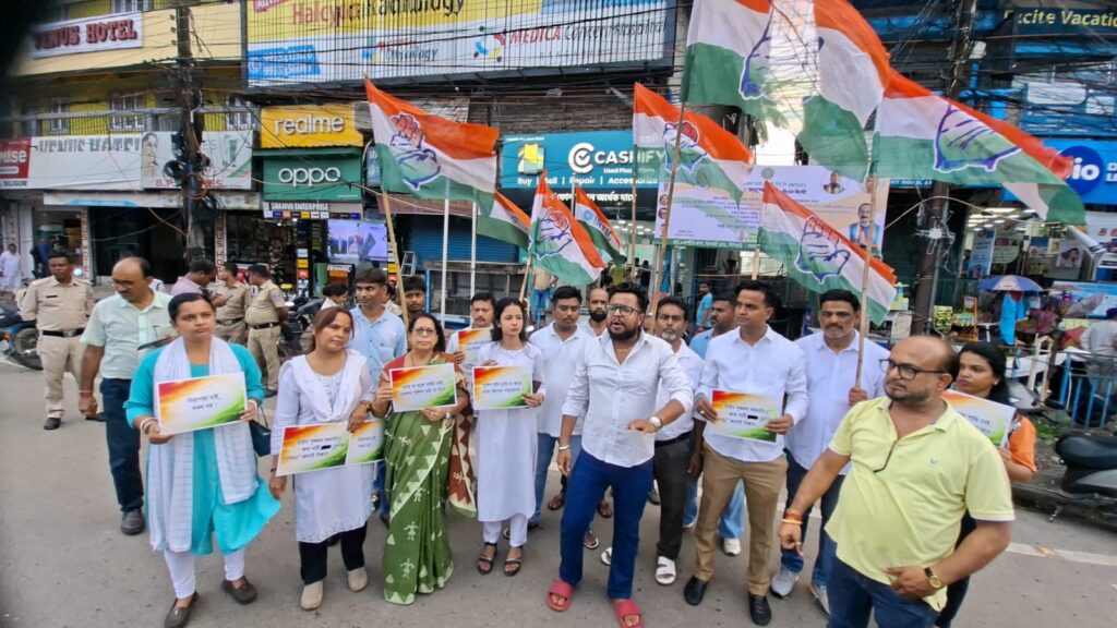 চুরি, ডাকাতি, ধর্ষণ এবং নির্যাতন সহ একের পর এক অপরাধমূলক ঘটনা ঘটছে শিলিগুড়িতে।গতকাল শিলিগুড়ির একটি সোনার দোকানে দিনদুপুরে ডাকাতির ঘটনায় আতঙ্ক ছড়িয়ে পড়ে।এরপরই শহরের আইন শৃঙ্খলা নিয়ে প্রশ্ন উঠতে শুরু করেছে।সেই ঘটনার প্রতিবাদে সোমবার বিকেলে শিলিগুড়ির হাসমি চকে একটি প্রতিবাদ কর্মসূচির আয়োজন করে দার্জিলিং জেলা যুব কংগ্রেস।