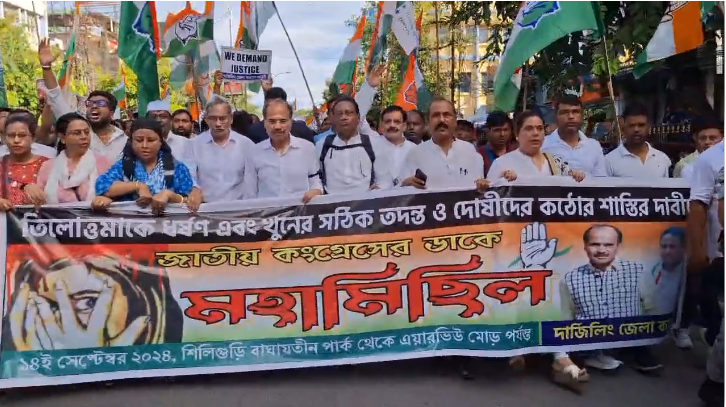 শিলিগুড়ি,১৪ সেপ্টেম্বরঃ আরজি কর কান্ডে দোষীদের কঠোর শাস্তির দাবিতে শিলিগুড়িতে মহামিছিল দার্জিলিং জেলা কংগ্রেসের।এদিনের মিছিলে পা মেলান প্রদেশ কংগ্রেস সভাপতি অধীর চৌধুরী। মিছিলটি শিলিগুড়ির বাঘাযতীন পার্ক থেকে শুরু হয়ে শহরের বিভিন্ন এলাকা পরিক্রমা করে এয়ারভিউ মোড়ে গিয়ে শেষ হয়।