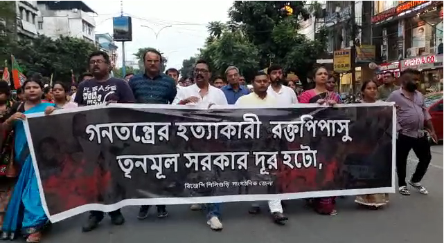 শিলিগুড়ি,১৬ জুনঃ পঞ্চায়েত নির্বাচনকে কেন্দ্র করে রাজ্যজুড়ে হিংসার ঘটনায় প্রশাসনিক ব্যর্থতার অভিযোগ তুলে শিলিগুড়িতে প্রতিবাদ মিছিল করল বিজেপি’র শিলিগুড়ি সাংগঠনিক জেলা কমিটি।