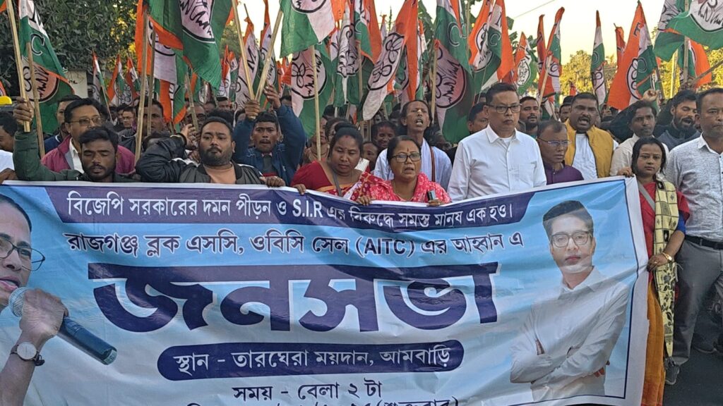 রাজগঞ্জ, ১২ ডিসেম্বরঃ বিজেপি সরকারের দমন–পীড়ন নীতি ও SIR-এর বিরুদ্ধে তৃণমূলের SC–OBC সেলের প্রতিবাদ মিছিল ও সভা আমবাড়িতে।