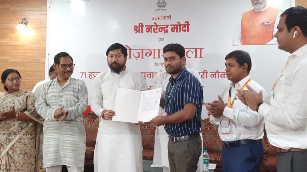 শিলিগুড়ি,১৩ এপ্রিলঃ যুবরাই দেশের ভবিষ্যৎ। তা বাস্তবায়িত করতে ২০২২ সাল থেকে কেন্দ্রের উদ্যোগে শুরু হয়েছে “রোজগার মেলা”। কেন্দ্রের বিভিন্ন বিভাগে সরাসরি চাকরি পাইয়ে দিতেই এই মেলার আয়োজন বলে জানা গেছে।বৃহস্পতিবার দেশের অন্যান্য রাজ্যের পাশাপাশি এরাজ্যেও রোজগার মেলার আয়োজন করা হয়।এদিন এনজেপি ভিআইপি গেস্ট হাউসে এই মেলার আয়োজন করা হয়।কেন্দ্রের স্বরাষ্ট্র প্রতিমন্ত্রী নিশীথ প্রামানিক, সাংসদ জয়ন্ত রায় সহ অন্যান্য বিজেপি বিধায়কদের উপস্থিতিতে এদিন ২৫৬ জন যুবক-যুবতীদের হাতে চাকরির নিয়োগপত্র তুলে দেওয়া হয়।